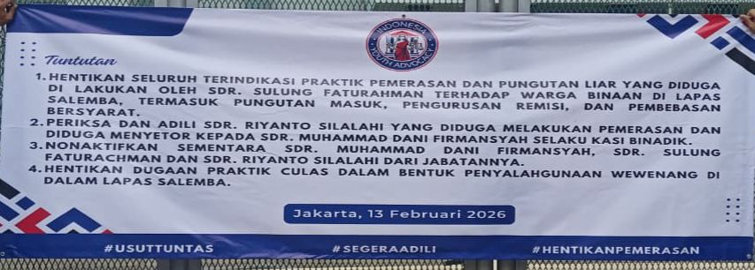 ASAMMANIS.NEWS – JAKARTA – Indonesian Youth Advocacy menggelar aksi unjuk rasa di depan Lapas Salemba, Jumat (13/2/2026). Aksi tersebut menyoroti dugaan praktik pemerasan terhadap warga binaan yang disebut terjadi di dalam lembaga pemasyarakatan tersebut.