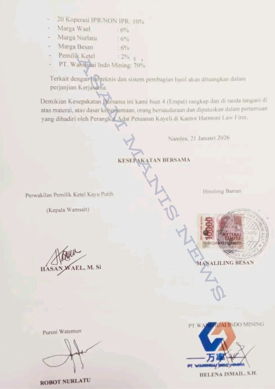Kesepakatan tersebut diklaim dibuat dalam empat rangkap dan ditandatangani di atas materai pada 21 Januari 2026 di Namlea. Pertemuan disebut berlangsung di Kantor Harmoni Law Firm dan dihadiri oleh perangkat adat Petuanan Kayeli.