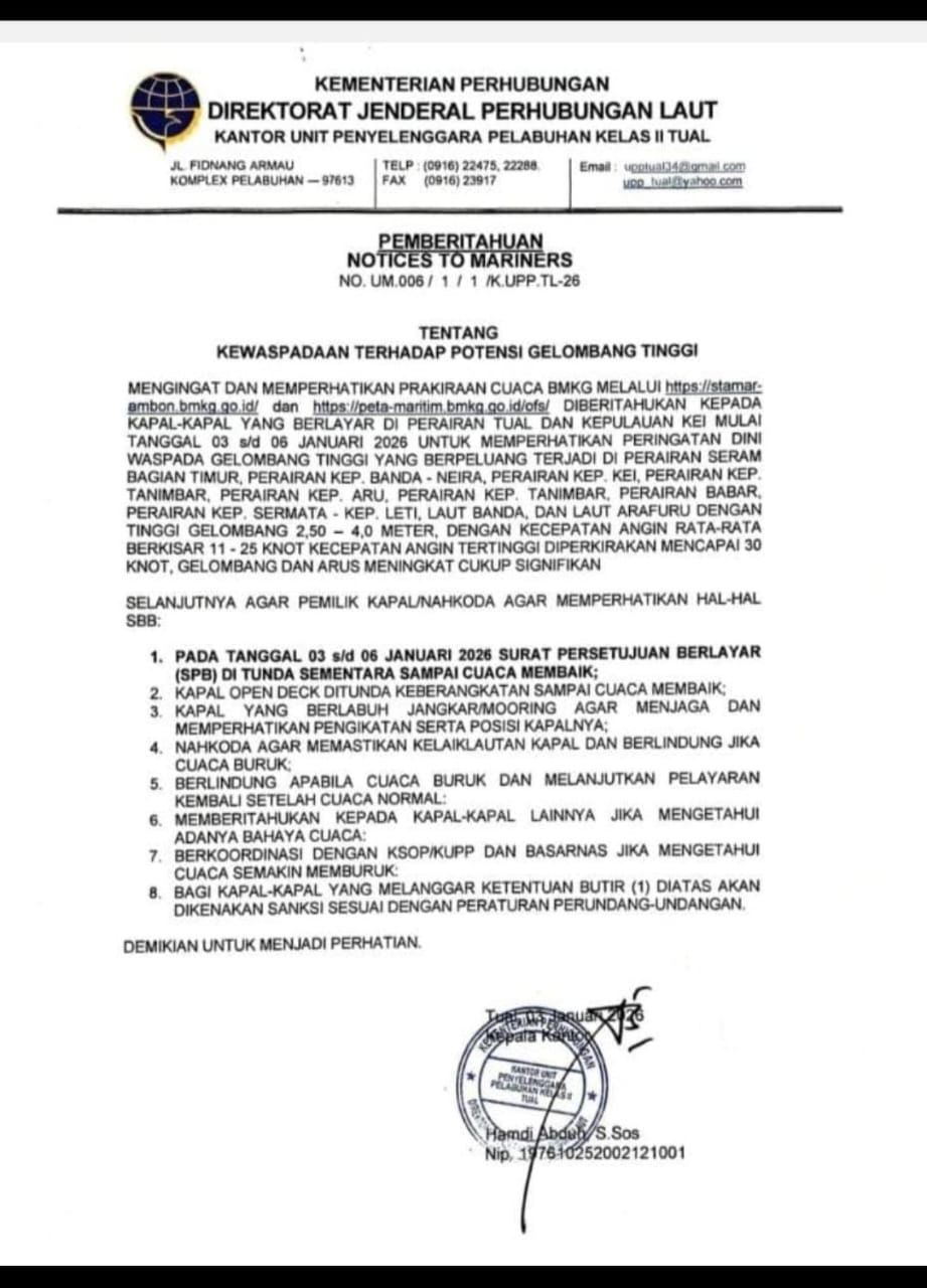 ASAMMANIS.NEWS — TUAL — Kantor Unit Penyelenggara Pelabuhan (UPP) Kelas II Tual menunda sementara aktivitas pelayaran di sejumlah perairan Maluku menyusul peringatan potensi gelombang tinggi yang diperkirakan terjadi pada 3 hingga 6 Januari 2026.